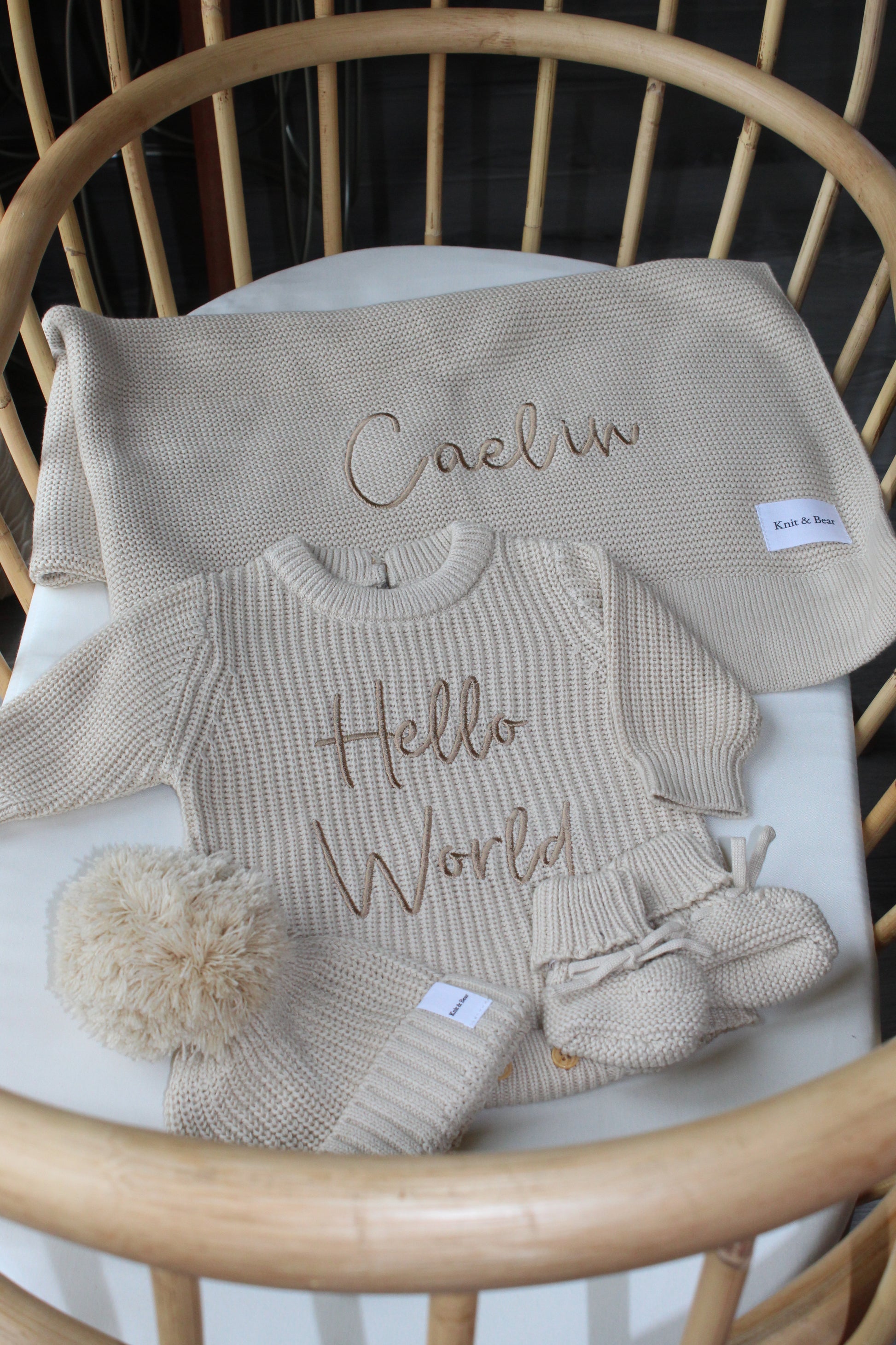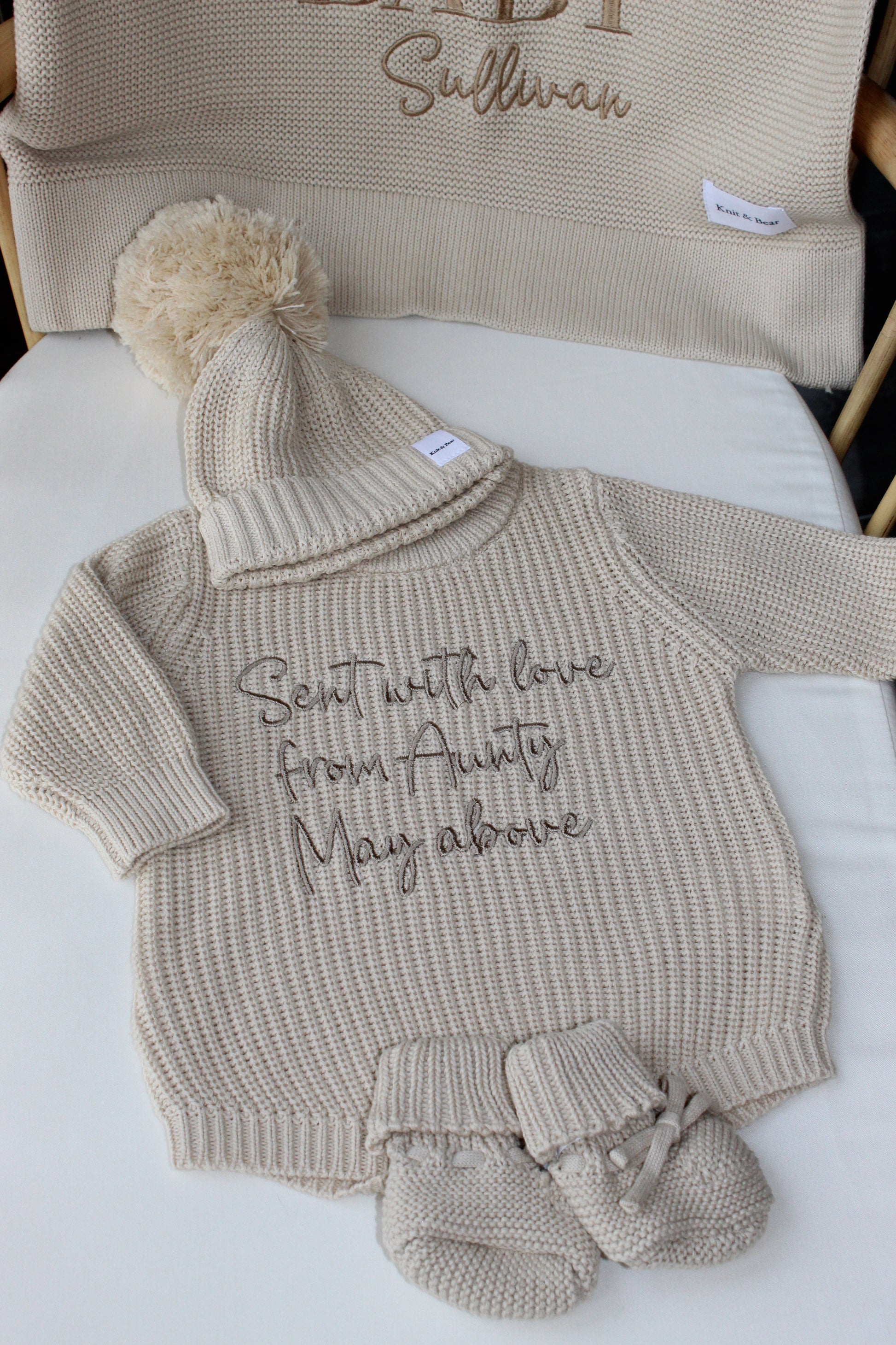 Check out our Instagram Highlights for ideas for selecting your desired font style and thread colour @knitandbear